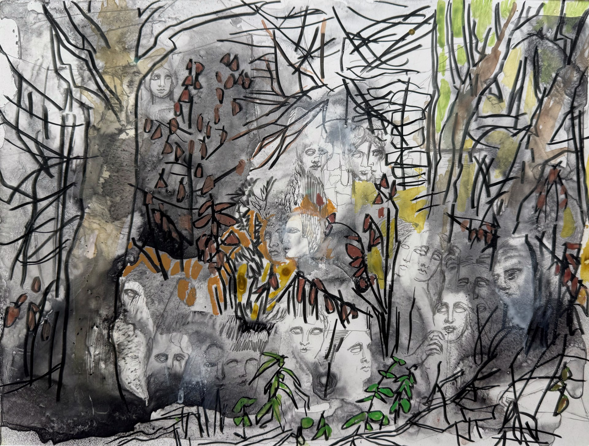 Jennifer brought “The Castle with the Angel” 1863 by Victor Hugo and her own mixed media on yupo drawing “Heads in the Brambles” 2025